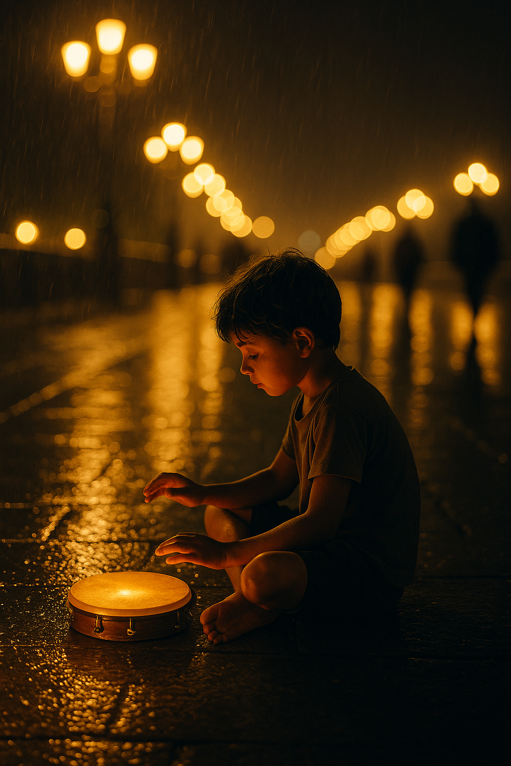 Luci leggere danzavano sul riflesso dell’acqua lasciata dalla pioggia. I passanti si fecero lentamente più fitti. Vadim prese il tamburello e iniziò a battere le mani, con gli occhi cercava uno sguardo da agganciare ma le teste rimanevano dritte. La musica ritmata gli accendeva il cuore.
